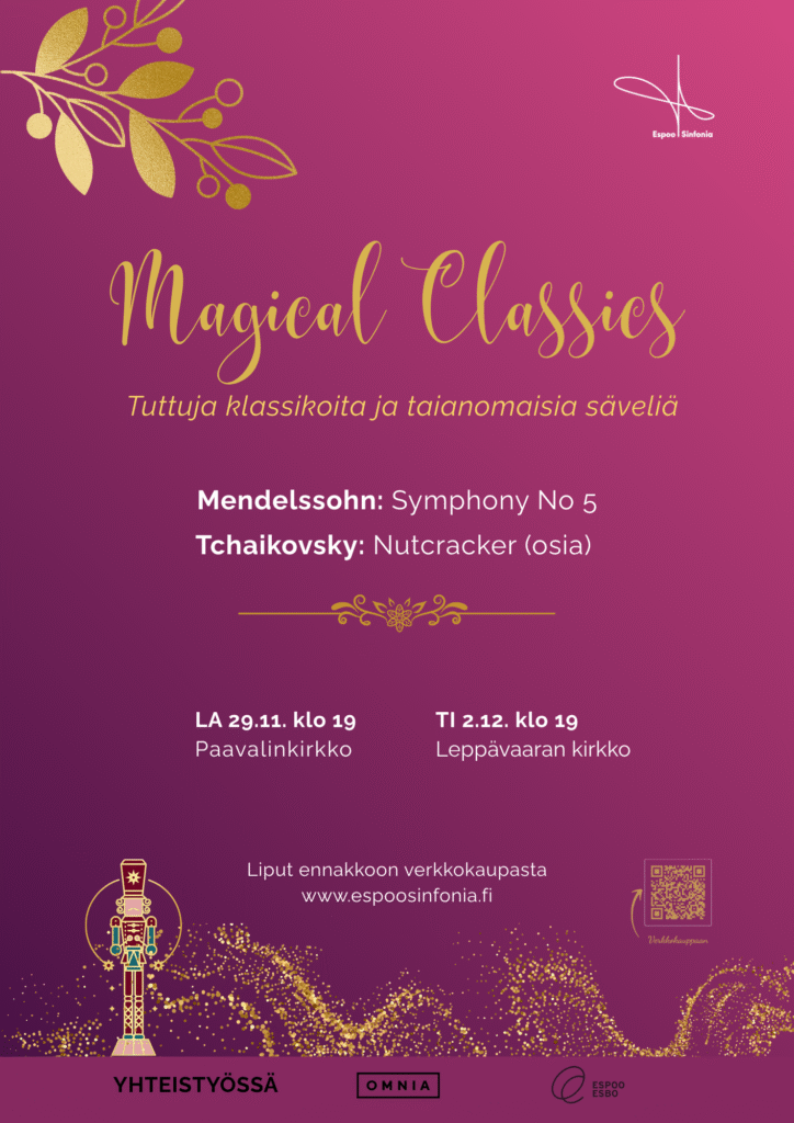 Magical Classics on konsertti, joka puhuttelee sekä klassisen musiikin ystäviä että ensikertalaisia. Tšaikovskin satumaiset sävelet tuovat lämmintä juhlan tuntua, Mendelssohnin sinfonia puolestaan sytyttää valon ja juhlan kirkkauden.